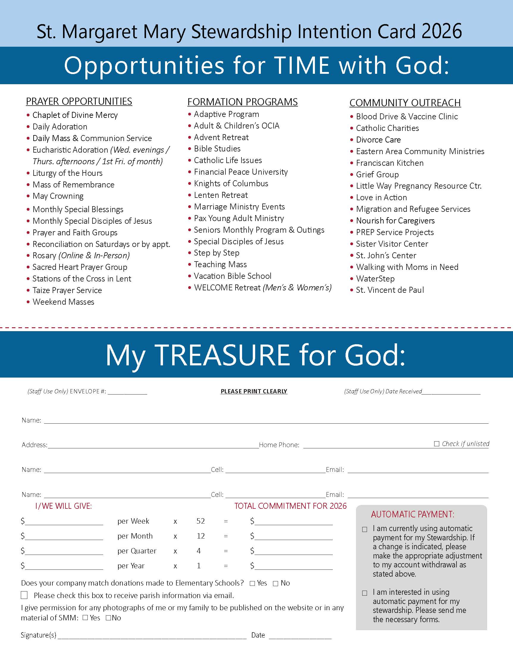 Stewardship is a reflection of our gratitude for God’s blessings and a chance to reaffirm our commitment of time, talent, and treasure. As we enter this renewal period, please consider how you can support our parish as a way of Growing in the Heart of Jesus. -Father Bill Hammer