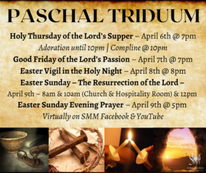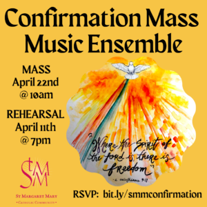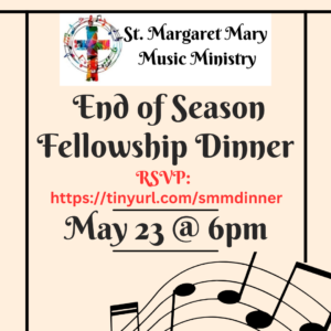 Our annual End of the Season Music Ministry Dinner will be May 23rd at 6pm. All music ministers from SMM and their families are invited, but RSVPs are needed by May 10th!