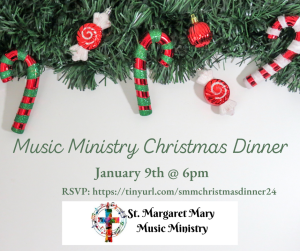 Save the date for our Music Ministry Christmas Dinner, Tuesday, January 9th @ 6pm in the Hospitality Room.