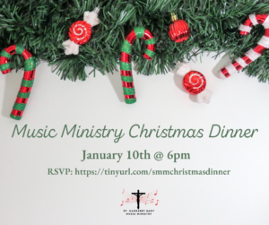 Save the date for our Music Ministry Christmas Dinner, Tuesday, January 10th @ 6pm in the Hospitality Room.