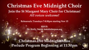 For more information or to join the music ministry at St Margaret Mary, please contact Dr. Holly Smith hsmith@stmm.org